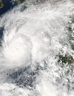 On October 8, the wind shear that had been negatively affecting Jova began to subside. Combined with favorable sea surface temperatures (SSTs) of 82–84 °F (28–29 °C), Jova began to strengthen more significantly as it moved north of the steering ridge and turned eastwards.[1] Microwave satellite imagery revealed a nascent eye and eyewall late on October 8, marking Jova's intensification into a hurricane.[4] The inner core continued to improve in organization into October 9, with the eye contracting to a diameter of 17 mi (28 km). A reconnaissance aircraft investigating the storm also estimated that the central pressure fell at a rate of 3 mbar (0.089 inHg) an hour, indicative of a quickly strengthening system.[5] Jova became a major hurricane by 06:00 UTC on October 10 and reached its peak intensity twelve hours later with maximum sustained winds of 125 mph (205 km/h)—at the upper end of Category 3 intensity on the Saffir–Simpson scale. The minimum central pressure was 955 mbar (28.20 inHg), as derived from dropsonde data.[1]