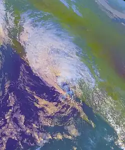After the system had weakened into a category 1 hurricane, a fresh burst of atmospheric convection wrapped around Nora's eye, as the flow from a trough of low pressure that was associated with the remnants of Typhoon David caused the system to turn and accelerate northwards.[3][22][23] Warm waters off the west coast of Baja California allowed the system to reintensify slightly and weaken slower than most tropical cyclones in the region, before it made landfall near Punta Eugenia in Baja California Sur at about 22:30 PST on 24 September (06:30 UTC, 25 September).[3][4][24] The system subsequently moved over water in the vincinty of the Sebastián Vizcaíno Bay, before it made landfall at about 03:00 PST (11:00 UTC) to the south-southeast of San Fernando in Baja California as a Category 1 hurricane.[3][18][24] As Nora moved northwards over the peninsula, atmospheric convection became less organized and the eye disappeared from infrared imagery, which caused the NHC to presume that it had weakened into a tropical storm.[8][25] Later that day, Nora emerged into the northern Gulf of California and skirted the western coast as it moved northwards, before it made its final landfall near the mouth of the Colorado River to the west of Puerto Penasco, Sonora.[1][2][25]