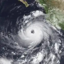 During 20 September, Nora started to drift north-northwestwards along a ridge of high pressure, into an area of very warm sea-surface temperatures parallel to Mexico's western coast.[1][14] Over the next day, atmospheric convection surrounding the eye increased and quickly cooled, as the hurricane quickly intensified and ultimately peaked as a Category 4 hurricane with 1-minute sustained windspeeds of 130 mph (215 km/h).[8][15][16] At this time the system was located about 245 mi (395 km) to the southeast of Socorro in the Revillagigedo Islands and was starting to move over waters that Hurricane Linda had cooled a few weeks earlier, while it was a Category 5 hurricane.[4][8][17] As a result, Nora weakened into a Category 3 hurricane, before it passed within 60 km (35 mi) of Socorro in the Revillagigedo Islands during 22 September.[8][18][19] Over the next day, the hurricane continued to move over Linda's wake and gradually weaken with the eye becoming ragged, cloud tops warming and its eyewall becoming broken.[4][20][21] As a result, the system was classified as a Category 1 hurricane at around 04:00 Pacific Standard Time (12:00 UTC) on 23 September, while it was located about 285 km (175 mi) to the southwest of Cabo San Lucas on the Baja California peninsula.[8]