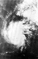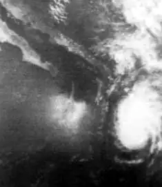 Further investigation into the hurricane was limited to ship reports, and a satellite image on October 1 was mostly not helpful due to another electronic problem; however, it showed that the hurricane had shrunk. A United States Air Force reconnaissance plane flew into the hurricane that day and reported that the eyewall was open on the southwest quadrant. After the breakup of the first eyewall, a break in the clouds lead to the possibility that another eye was forming 30 mi (48 km) to the north-northwest of the previous eye.[1]