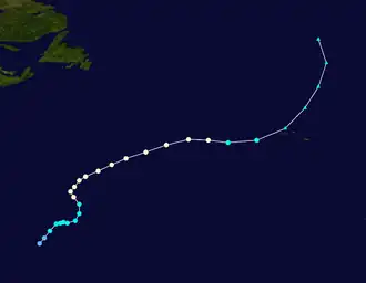 The origins of Hurricane Tanya were from a tropical wave that moved off the western coast of Africa in the middle of October. The wave closely followed the path of Tropical Storm Sebastien and was unable to develop in the tropical Atlantic as it moved westward. The system did not begin to become organized until October 25 while south-southeast of Bermuda. However, the Dvorak technique was still unable to classify the system until October 26 as the low-cloud swirl became better organized while moving northward in the central Atlantic. That evening, a closed circulation had formed, and it was classified as Tropical Depression Twenty-One by the National Hurricane Center. On the morning of October 27, it strengthened into a tropical storm, becoming the 19th as well as the final named storm of the season.[1] Operationally, it was not declared a tropical cyclone until that point, when it was immediately declared Tropical Storm Tanya.[2]