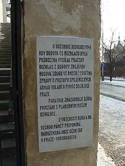 The tower was used between 7 and 9 May 1945 as an impromptu radio tower during the Prague uprising, when it sheltered Czech resistance fighters who were trying to evict the occupying German forces from the city.[1]