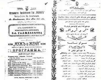 The operetta's themes centre on the family and everyday life, oppression in the family and Azerbaijani woman in society.[2] The premiere was held on May 24, 1910, in Baku, in the theatre-circus of the Nikitin brothers. Huseyngulu Sarabski (Marjan bey), Ahmed Agdamski (Minnat khanim), M.H.Teregulov (Safi) and Mirzagha Aliyev (Kerbelayi Gubad) played the leading parts, Huseyn Arablinski was the stage director and Uzeyir Hajibeyov was the conductor. Husband and Wife was subsequently staged in other theatres in Azerbaijan, including Nakhchivan, Aghdam and Shaki.[3][4][5][6]