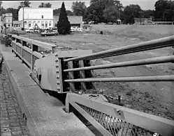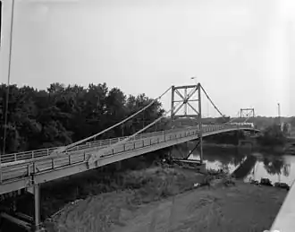 Although the bridge was determined eligible for inclusion in the National Register of Historic Places in 1987 due to the rarity of its type,[1] the bridge was replaced in 1988 and demolished, with the replacement bridge being made of concrete and supported by pillars instead of suspension.