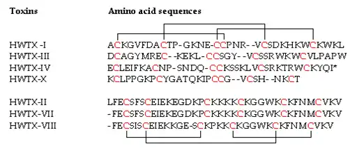 HWTX-VII and HWTX-VIII are composed of 35 and 36 amino acid residues respectively, both including six cysteines. They might adopt similar structural scaffolding and the same disulfide bridge pattern as HWTX-II.[24]