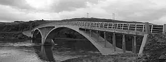 The Hvítá bridge (Icelandic: Hvítárbrú [ˈkʰviːtˌaurˌpruː], unofficial name) is a single-lane road bridge opened in 1928 traversing the Hvítá river in western Iceland. It is a reinforced concrete bridge consisting of two arches with a total length of 106 metres (348 ft). Until the opening of the bridge over the Borgarfjörður at Borgarnes in 1981, it was part of the main road connection between northern and southern Iceland. On the 2002 anniversary convention of Verkfræðingafélag Islands, the Icelandic engineering association, the bridge was awarded the most outstanding Icelandic engineering project of the 1921-1930 decade.[1]