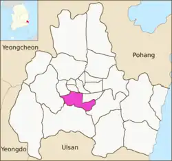 Hwangnam-dong is a dong or a neighbourhood of the Gyeongju City, North Gyeongsang province, South Korea. It is bordered by Dodong-dong on the east, Tapjeong-dong on the west, Naenam-myeon on the south and Jungang-dong on the north. Its 20.5 square kilometers are home to about 8,885 people. It is both an administrative and legal dong.[1]
