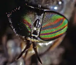 Face is black haired, with high antennal bows. Palpi are blackish with black hairs. The compound eyes are well-developed in both sexes. They have an iridescent light green pigmentation, with three blue-reddish transversal bands.[7][8]