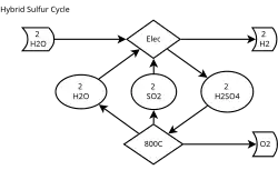 The hybrid sulfur cycle (HyS) is a two-step water-splitting process intended to be used for hydrogen production. Based on sulfur oxidation and reduction, it is classified as a hybrid thermochemical cycle because it uses an electrochemical (instead of a thermochemical) reaction for one of the two steps. The remaining thermochemical step is shared with the sulfur-iodine cycle.