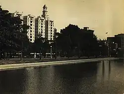 It was won by architect, planner, landscape designer and engineer Norman Weekes (1888–1972) with a finely delineated design drawn by young architect Raymond McGrath (1903–1977) and influenced by the "City Beautiful" movement.[13] This design evolved with the active criticism of the assessors, architect and town planner John (later Sir) Sulman, architect Alfred Hook (Associate Professor of Construction, Architecture Faculty, Sydney University) and Town Clerk (and closely involved in the park's management) W. G. Layton, who wrote a masterly report assessing the design, pointing out its shortcomings and enunciating the design philosophy followed. Landscape historian Georgina Whitehead describes Weekes' design as an accomplished melange of modern City Beautiful, Beaux Artes and Art Deco inspiration.[38][1]