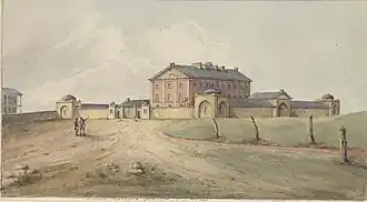 The accommodation soon proved inadequate and up to 1400 men were housed in the Barracks at any one time. It has been estimated that perhaps 30,000 men and boys passed through the Barracks between 1819 and 1848.[13] The convict response to the Barracks was somewhat mixed: those that were able to pay for lodgings by working on Saturday were not happy about the confinement; others were happy to have a roof over their heads. In 1820, in order to ease the pressure on the crowded Barracks the reward of being allowed to live outside the Barracks was extended. Convicts found gambling, drunk, engaged in street violence, or other unseemly behaviour had this freedom revoked and were sent to live in the Barracks. It had become a form of punishment. Loitering or idling on a Saturday was also punishable by confinement to the Barracks. Convicts had a peculiar mix of detention and freedom, convicts had to work for the Government during the week, but were allowed to work for their own benefits on Saturdays. This was a privilege Governor Macquarie did not like to see abused.[7]