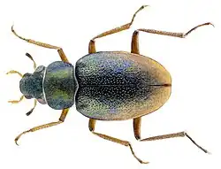 Hydraenidae is a family of very small aquatic beetles, sometimes called "Minute moss beetles", with a worldwide distribution. They are around 0.8 to 3.3 mm in length. The adults store air on the underside of the body as well as beneath the elytra which allows them to crawl underwater, often on the underside of the water surface tension, though they cannot swim. Some species have gills that effectively allow them to stay underwater indefinitely. Larvae vary from being fully terrestrial, to being aquatic at least in their earliest instars. The diet of hydraenid larvae and adults is thought to consist of algae, spores and other plant matter. At least some hydraenid adults use stridulation to communicate. There are around 1,300 species in 42 genera.[1]