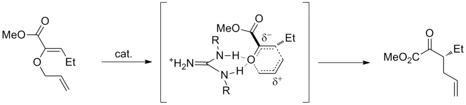 A demonstrative example is the catalysis of Claisen rearrangements of ester-substituted allyl vinyl ethers reported by the Jacobsen research group.[9] A chiral guanidinium catalyst was found to promote the reaction near room temperature with high enantioselectivity. During the transition state, the fragment coordinated to the amidinium catalyst develops partial anionic character due to the electronegativity of the oxygen and the electron-withdrawing ester group. This increases the strength of hydrogen bonding and lowers the transition state energy, thus accelerating the reaction.
