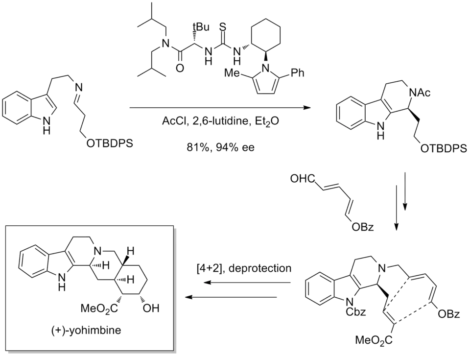 In the Jacobsen synthesis of (+)-yohimbine,[30] an indole alkaloid, an early enantioselective Pictet-Spengler reaction using a pyrrole-substituted thiourea catalyst produced gram-scale quantities of product in 94% ee and 81% yield. The remainder of the synthesis was short, using a reductive amination and an intramolecular Diels-Alder reaction.