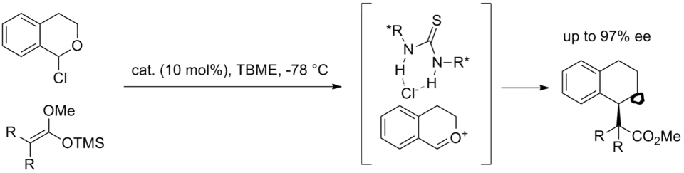 Asymmetric ion pairs can also be attacked in intermolecular reactions. In an interesting example, asymmetric addition of enol silane nucleophiles to oxocarbenium ions can be effected by catalytically forming the oxocarbenium through anion binding.[13] Starting from an acetal, the chloro ether is generated with boron trichloride and reacted with the enol silane and catalyst. The mechanism of formation of the oxocarbenium-thiourea-chloride complex is not fully resolved. It is thought that under the reaction conditions, the chloro ether can epimerize and thiourea can stereoselectively bind chloride to form a closely associated ion pair. This asymmetric ion pair is then attacked by the silane to generate alkylated product.