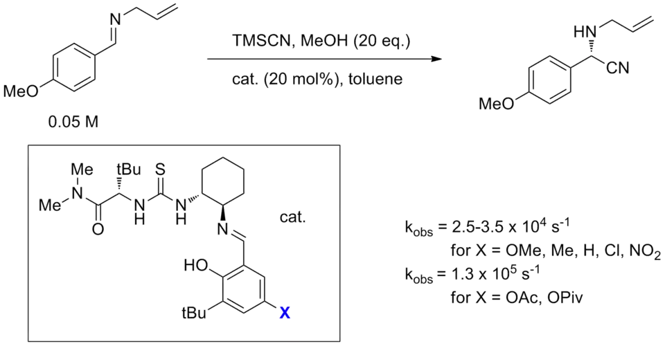 Furthermore, the effect of varying substituents on the catalyst is rarely well understood. Small substituent changes can completely change reactivity or selectivity. An example of this was in the optimization studies of a bifunctional Strecker reaction catalyst, one of the first well-studied thiourea catalysts.[29] Specifically, varying the X substituent on the salicylaldimine substituent, it was found that typical electron-withdrawing or electron-donating substituents had little effect on the rate, but ester substituents such as acetate or pivaloate seemed to cause noticeable rate acceleration. This observation is difficult to rationalize given that the X group is far from the reactive center during the course of the reaction and electronics do not seem to be the cause.