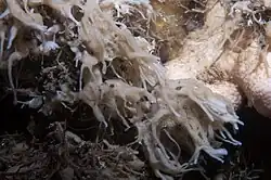 Sponges draw water in through small pores, filter out the organic particles less than 2μm in diameter, and expel the water and any larger particles through the oscula. The diet of Hymeniacidon kitchingi is mainly bacteria, unicellular algae, and organic debris. It has been calculated that a 10 cm3 (0.6 cu in) sponge can filter 22.5 L (5 imp gal; 6 US gal) of water per day.[3] The sponge is a hermaphrodite. After fertilisation, the embryos are brooded inside the sponge, and when they reach the last embryonic stage, they pass out through the oscula into the water column. They drift with the plankton, and after a few hours, settle on the seabed, attach themselves to the substrate and become juvenile sponges. The sponge can also reproduce asexually by budding, and like all sponges, it has great powers of regeneration.[3]