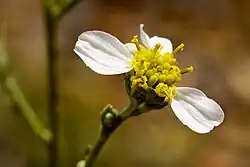 Hymenopappus biennis is a biennial herb up to 100 cm (39 in) tall. It produces 20-40 flower heads per stem, each head with 8 white ray flowers surrounding 32–50 yellow disc flowers.[3]