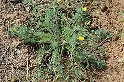 The species is a winter-blooming annual herb. It has a great number of grey-green leaves, which are connected to the stem by a 1–3 cm long petiole. The leaf blade is roughly lance-shaped, measuring 4–11 cm long and less than 2.5 cm wide. Two or three leaflets branch out from a blade which are linear or bristle-like and 1–3 mm long. There are up to 20 flowering stalks from the central rosette which eventually bear many flowers. The first flower usually grows 5–15 cm from the base of the stalk. The bracts are paired, and gradually get smaller the further up the flowering stalk they are. The sepals are around 2 mm long and oval shaped, remaining on the plant once they develop. The petals are yellow but can sometimes have dark spots or streaks. There are around 30–40 blackish seeds that are rectangular in shape and around 1 mm long.[1]