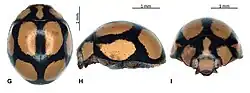 Adults reach a length of about 3.30 mm. Adults have a yellow head and the pronotum is black with three yellow spots. The elytron is black with three large yellow spots.