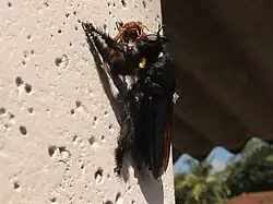 Hyperechia xylocopiformis is a species of robber fly found in India and Sri Lanka. Like other species of Hyperechia they mimic the Xylocopa species of carpenter bees.[2] [3] The type specimen was collected by Walter Elliot from Madras and described by Francis Walker. The larvae live in the nests of carpenter bees and feed on their larvae while adults prey on wasps and bees including carpenter bees.