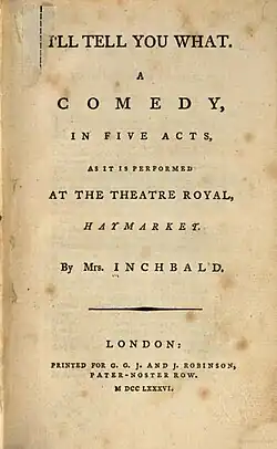I'll Tell You What is a 1785 comedy play by the English writer Elizabeth Inchbald. It premiered at the Theatre Royal, Haymarket in London on 4 August 1785.[1] The original cast included John Palmer as Major Cyprus, Robert Bensley as Anthony Euston, James Aickin as Colonel Downright, James Brown Williamson as Sir George Euston, John Bannister as Charles Euston, Robert Palmer as Sir Harry Harmless, William Parsons as Mr Euston, Mary Bulkley as Lady Euston and Elizabeth Farren as A Young Lady. The Irish premiere took place at the Smock Alley Theatre in Dublin on 12 December 1785.[2]