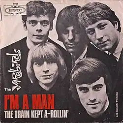 The Yardbirds recorded the backing track at Chess Studios in Chicago on September 19, 1965.[11] They overdubbed further elements on the 21st and 22nd at Columbia Studios in New York.[12] On October 11, Epic Records released "I'm a Man" as a single in the US, with "Still I'm Sad" as the B-side.[13] It peaked at number 17 on the Billboard Hot 100.[10] In Canada, the single was released by Capitol and reached number 4 on the RPM singles chart.[14] The song was included on their 1965 Epic Records album Having a Rave Up and was later released in the UK in 1976. Diddley praised their cover as "beautiful"[15] and it has been called "a defining moment for the band".[10]