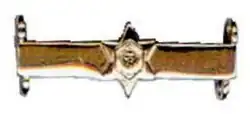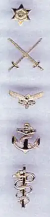 Award of the decoration for service in active military operations is indicated by distinguishing insignia, which indicate the arm of the service in which the recipient was serving at the time of the action for which the decoration was conferred. The insignia are struck in silver-gilt and is worn on the ribbon, above any bars which may have been awarded.