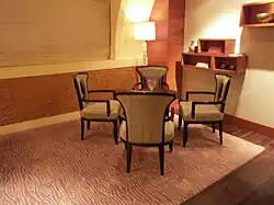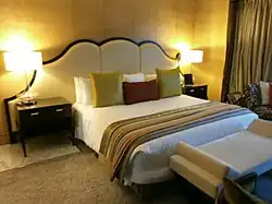 The hotel's 600 rooms include 522 rooms and 78 serviced apartments. The rooms include 326 Executive Club rooms, 31 Eva rooms, 132 Towers rooms, 48 ITC One rooms, 14 Deluxe Suites each measuring 1,164 sq ft, a presidential suite named the Karikalan Suite and a six-bay grand presidential suite named the Rajaraja Chola Suite spread over 4,380 sq ft. The single rooms occupy an area of 615 sq ft with exclusive lounge and private butler, and a distinct wing—named the Eva wing—for female guests spanning the entire wing of the second floor, with rooms measuring 405 sq ft. The hotel has three wings: the first or primary wing houses all Executive Club rooms, and the second wing contains ITC One rooms, Towers rooms and all the Suites. The third wing has been constructed exclusively for the Residences, offering the luxury accommodation.[26] Spread over an area of 615 sq ft, the Towers rooms have an exclusive entrance and are spread across the first floor all the way up to the seventh floor. The Executive Club rooms, with an area of 405 sq ft, are spread across the second floor all the way up to the tenth floor of the first wing. The hotel has a total of 10 food and beverage locations,[27][24] including Peshawri, which serves cuisine from the Northwest Frontier, and Royal Vega, a vegetarian restaurant. Others include Madras Pavilion, Cafe Mercara, Nutmeg, Cheroot Lounge, Pan Asian, Modo Mio, The Pub, Tranquebar,[28] and Ottimo-Cucina Italiana.[29] Leisure facilities include a 23,000-sq-ft Kaya Kalp Spa with 12 treatment rooms, 2 hamams, a yoga studio, a tea lounge, a men's salon and a salon for women;[17] outdoor pools (with one exclusively for families);[24] gyms for each of the three wings; and a shopping area.[30] There are three swimming pools in the hotel—the rooftop pool with twin smaller pools, a children's pool, and a Jacuzzi, all situated above the banquet hall.[17][31] The WelcomArt Gallery at the hotel showcases curated selection of art pieces that reflect the Chola-theme of the hotel.[28] RFID columns are installed in the floors to enable the staffs greet the guests by names and offer them a personalised service.[17] The hotel also uses iPad-controlled technology.[23]