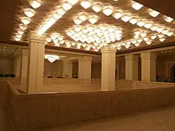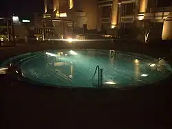 Commercial facilities in the hotel include restaurants, a health spa, 30,000-sq-ft banquet space to accommodate up to 600 guests, an exhibition space, a 2,625-sq-ft auditorium named Kalai with a seating capacity of 45,[29] and discreet levels that consist of board room and four meeting rooms, a private multiplex with a capacity of 100 guests and underground parking for 1,000 cars.[32] The hotel has obtained a Platinum rating (the highest on the scale) from Leadership in Energy and Environmental Design (LEED), an internationally recognised green building certification system. The hotel is currently the world's largest LEED-certified green hotel.[27] The hotel has a total workforce close to 4,000 people with over 1,000 people engaging in day-to-day operations.[11] Initially, the hotel also planned to construct a helipad on the terrace,[33] for which the multi-storey building panel of CMDA has denied permission in October 2011.[3][34]