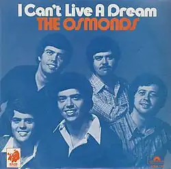 The song reached number 46 in the U.S.[1] and number 50 in Canada. It was a marginally better performer on the Easy Listening charts, peaking at number 38 in the U.S. and number 35 in Canada.[2] In the United Kingdom, "I Can't Live a Dream" reached number 37. "I Can't Live a Dream" would be the final top-100 pop hit in any country for the Osmonds in their classic lineup, and the last of any configuration of the group to date (not counting solo records).