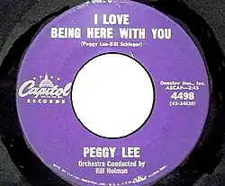 "I Love Being Here with You" is a song written by Peggy Lee and Bill Schluger.[1][2][3][4][5][6] It was released by Capitol Records in 1961 as the B-side to her single "Bucket of Tears", and then on the album Basin Street East Proudly Presents Miss Peggy Lee. Orchestration was arranged and conducted by Bill Holman.[7] Though released as a B-side, it quickly became a popular song with other artists.