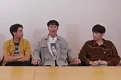 Director Naruebet (centre), with lead actors Putthipong (left) and Krit, at a publicity interview in October 2020