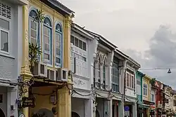 Naruebet envisioned visually rich imagery for the series, and wanted a locale that would serve as an atmospheric backdrop. The writers briefly considered Ayutthaya, as well as several other provinces, before settling on Phuket, which offered the combination of beaches, hills, and an urban environment.[2] With a rough draft for the story, the team conducted a research trip to the Southern island province in late January. They took inspiration from Phuket's multicultural heritage, Sino-Portuguese architecture and local cuisine, and set the story mainly in Phuket's Old Town.[5][7] Several food items are featured in the story, including the Hokkien noodles sold by Teh's mother and the dessert o-aew, which inspired the name of Krit's character. The names of the characters Teh and Hoon, meanwhile, are from the Hokkien words for tea (; ) and rice vermicelli (米粉; bí-hún), one of many nods to the Hokkien Chinese heritage which forms a large part of Phuket's culture.[8] Chinese culture is also featured in the story through the language (as Mandarin), which plays a central role in the university-admissions plot, contributed to by language consultant Suppawat Zhou. Phuket's pluralism is also reflected through language, with several characters speaking in the Southern Thai dialect and employing code switching during conversation.[5]
