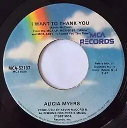 "I Want to Thank You" is a song by American singer Alicia Myers, released in 1981, originally as a track from her debut album, Alicia (1981). The song was later included as a single on her 1982 album, I Fooled You This Time, due to its heavy rotation in clubs by DJs in the United States and United Kingdom.[1] The song was written by Kevin McCord, bassist for Myers' former band One Way, who also produced it alongside Irene Perkins. It debuted on the US Billboard Hot Black Singles chart, where it ran for 11 weeks, peaking at number 37 in November 1982.[2] In 2022, Rolling Stone ranked "I Want to Thank You" number 136 in their list of the "200 Greatest Dance Songs of All Time".[3]