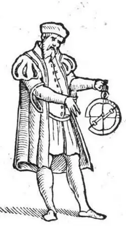 Once out of sight of the coast, Portuguese and Spanish ship pilots could rely upon the astrolabe and quadrant to determine their location on a north–south reference, however longitude was noticeably more difficult to acquire. The problem was time. Out on the vast stretches of the ocean, it is very difficult to keep track of time once leaving port. In order to calculate longitude a sailor would need to know the time difference between his current location and a fixed point somewhere on earth, usually the port of call. Even if one could determine the time of day while in deep waters, they still needed to know the time at their home port. The answer was the ephemerides, astronomical charts plotting the location of the stars over a distinct period of time. The German astronomer Regiomontanus published an accurate day-to-day Ephemerides in 1474.[13] Published in 1496 by the Jewish astronomer, astrologer, and mathematician Abraham Zacuto, the Almanach Perpetuum included tables for the movements of stars.[14] Through the use of an astrolabe, also perfected by Zacuto who advanced it from a crude wooden tool to an accurate brass instrument, sailors could determine the time at home. Zacuto himself was born in Spain in 1451 and took refuge in Lisbon during the expulsion of the Jews. He eventually was invited by King John II of Portugal, much like Pedro Nunes, to become the Royal Astronomer, a position he accepted and used to promote exploration, particularly investigating a sea route to India.[14]