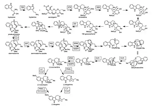 - ^ Büchi G, Coffen DL, Kocsis K, Sonnet PE, Ziegler FE (1966). "The Total Synthesis of Iboga Alkaloids". J. Am. Chem. Soc. 88 (13): 3099–3109. Bibcode:1966JAChS..88.3099B. doi:10.1021/ja00965a039.