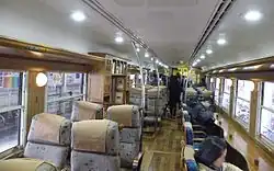 The interior design of the train was overseen by industrial designer Eiji Mitooka.[3] The train features totally new interiors with extensive use of wood for flooring, wall panels, and seating. Some seats are arranged facing the windows on the seaward side of the train.[3]