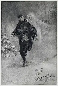 ![]() "What fearful shapes and shadows beset his path amidst the dim and ghastly glare of a snowy night!" by Frederick Simpson Coburn (1899). Ichabod Crane walks home after an evening listening to ghost stories. | |
