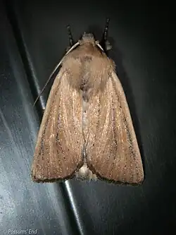 Ichneutica blenheimensis is a species of moth in the family Noctuidae.[1] It is endemic to New Zealand and is found throughout the North, South and the Stewart Islands. This species appears to prefer drier eastern localities and is rarely collected in western North Island forested areas. It does not appear to be frequently collected in inland dry tussock grassland habitats. The host plant for the larvae of this species is likely to be the golden sand sedge pīngao which is now absent from the moths type locality. However Chappell has raised very young larvae on grass species and the more developed larvae consumed Phormium tenax. Adults are on the wing from November to March and are attracted to both light and sugar traps. The blackish forewing fringes are diagnostic of this species. But worn specimens of I. arotis can be confused with worn specimens of I. blenheimensis.[2] However I. arotis can be distinguished from I. blenheimensis as it has a scale-tuft on the thorax and dark longitudinal stripes on the tegula. This species is classified as "At Risk, Naturally Uncommon" by the Department of Conservation.