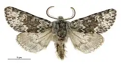 Face grey. Palpi blackish at base. Head and thorax grey, frontal area lighter grey. Head and thorax densely clothed with long dark-grey hair. Thorax broad in proportion to length, with a slight posterior crest. Abdomen grey. Forewings grey, with pale grey lines and occasional darker marks. A single light-grey line at base; a jagged grey line about 1⁄5, strongly dentate near dorsum; outwardly suffused with dark grey. Orbicular faintly shown in light grey, and separated from reniform by a distinct dark-grey patch. Reniform faintly outlined in light grey. A jagged light-grey line at 3⁄4, bending towards termen until centre of wing, then inwards before reaching dorsum. Terminal edge margined with light grey, edged basally with a dark suffusion, which forms a faintly defined line; slight grey marks along veins where they reach termen. Cilia short, light grey and dark grey alternate patches. Hindwings light grey with a faint ochreous tinge, a darker band across wing at J and a slightly waved subterminal band. Terminal edge and cilia grey-white. Underside grey with a faint ochreous tinge and a well-defined irregular dark-grey line at about 3⁄4 across both wings.[2]