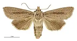 ♂♀. 40-44 mm. Head and thorax light greyish-ochreous, thorax with two pairs of fine oblique black lines or series of specks, prothorax with strong triangular crest. Antennae in ♂ moderately fasciculate-ciliated. Abdomen pale greyish-ochreous with fine black specks, densely hairy towards base. Anterior tarsi with two apical joints black. Forewings light - brownish, with scattered black specks, towards base and costa suffused with light greyish-ochreous; first line represented by two or three black dots, second line by a series on veins; two white dots longitudinally placed about lower angle of cell, connected by grey suffusion; a terminal series of black dots between veins : cilia light brownish-ochreous. Hindwings fuscous, paler and tinged with pale greyish-ochreous towards base; cilia whitish-ochreous, tips whitish.[3]