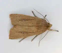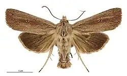 Ichneutica epiastra is a moth of the family Noctuidae.[1] It is endemic to New Zealand and is found throughout the North, South and Stewart Islands. This species prefers open habitats such as wetlands, dunes and forest clearings. Eggs are laid in the summer or autumn and larvae feed during winter and spring. The larval host species are found within the genus Austroderia. The adult moths are on the wing between October and February. Adult I. epiastra can possibly be confused with the similar species I. arotis and I. haedifrontella however there are differences in appearance that enables I. epiastra to be distinguished from these two species. In particular I. epiastra has long sharp-tipped ‘horns' on its head that are diagnostic. The adults of this species appear reluctant to be attracted to light although they do come more frequently to the brighter mercury vapour traps.