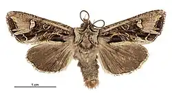 Male and female. Ferruginous-cinereous. Palpi stout, obliquely ascending, not rising so high as the vertex; third joint conical, very minute, not more than one-eighth of the length of the second. Antennae of the male very slightly pectinated for full two-thirds of the length. Fore tegulae of the thorax with a black band, which is curved on each side. Abdomen brownish, extending somewhat beyond the hind wings, crested towards the base, reddish on each side and with a small reddish apical tuft in the male. Fore wings varied with glaucous-cinereous and with blackish, the former hue forming an irregular and interrupted submarginal band, which extends along the costa in three streaks to the exterior border; some zigzag black lines; orbicular and reniform marks of the usual shape; the first bordered with pale cinereous; the second wholly pale cinereous; fringe with pale cinereous longitudinal streaks. Hind wings brown. Length of the body 7 — 8 lines; of the wings 18— 20 lines.[5]