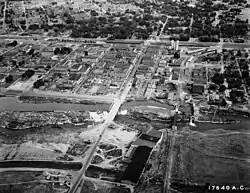 As soon as the railroad came through, settlers began homesteading the upper Snake River Valley in earnest. The first new settlers carved out homesteads to the north at Egin (near present-day Parker) and at Pooles Island (near present-day Menan).[11] The Utah & Northern Railway provided easy access, especially to homesteaders from Utah, who soon populated much of the area surrounding Eagle Rock. Some of these men had initially worked building the railroad, then later returned with their families to stake out new farms. These Utah families brought irrigation know-how developed in Utah's Great Basin settlements. Through their and others' canal systems, water from the Snake River made the Upper Snake River Valley into one of the most successful irrigation projects in the Mountain West.[12] Large-scale settlement ensued and within a decade, there appeared roads, bridges, and dams, which brought most of the Upper Snake River Valley under cultivation.
