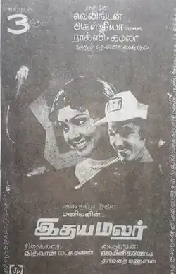 Idhaya Malar (transl. Flower of the heart) is a 1976 Indian Tamil-language romantic drama film directed by Gemini Ganesan and Thamarai Manaalan. It is based on the novel Ninaivugal Nilaikkatum, written by Maniyan.[1] The film stars Sujatha, Gemini Ganesan and Kamal Haasan. It was released on 3 September 1976.[2]