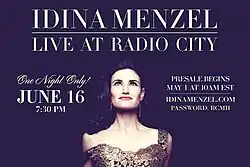 Idina Menzel: Live at Radio City was a concert by American singer-songwriter and actress Idina Menzel at Radio City Music Hall in New York City, New York on June 16, 2014. In the wake of the success of Disney's popular animated film Frozen (2013), in which Menzel starred as Elsa, Menzel announced in April 2014 that she will be headlining a one-night-only concert at Radio City Music Hall on her break from her eight shows a week.