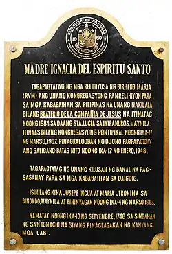 Ignacia del Espíritu Santo luco, also known as "Mother Ignacia" (February 1, 1663 – September 10, 1748) was a Filipino religious sister of the Catholic Church. She was known for her acts of piety and religious poverty and founded the Congregation of the Sisters of the Religious of the Virgin Mary, the first native Filipino female congregation with approved pontifical status in what is now the Republic of the Philippines.[1]
