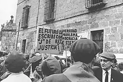 Ignacio was engaged in politics as young as 10, distributing Carlist electoral leaflets for his father in 1931.[33] Apart from the Requeté episode, during the Civil War he engaged in a Carlist student organization Agrupación Escolar Tradicionalista, mocking himself as the president of its Madrid branch on exile.[34] Having returned to the capital he engaged in local AET organization and emerged as one of its most active leaders. Together with a group of similarly minded peers, including Rafael Gambra and Francisco Elías de Tejada,[35] he staged minor and semi-private anti-Francoist demonstrations,[36] at one point in 1942 being detained and placed under security supervision.[37] The AET's most notable activity was the Academia Vázquez de Mella, a Carlist-flavored private educational initiative of Maximo Palomar; the experience formatted Larramendi reinforcing his penchant for social issues and for cultural rather than political dimension of Traditionalism.