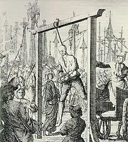 In the manhunt that followed Herriot was killed and Bonnet quickly recaptured,[3] but the event evidently left an impression on Pell. He turned King's evidence and agreed to testify against the crew of the Royal James and against Stede Bonnet personally. In his testimony, he confirmed the acts of piracy committed by the crew, though he made a point of exonerating a man named Thomas Nichols, claiming he had been pressed into service against his will and did not engage in the fighting.[4] He also stated that Bonnet was captain in name only, the true authority on the Royal James being quartermaster Robert Tucker. He unsuccessfully attempted to argue that Bonnet was therefore not responsible for the acts of piracy his crew had committed.[1]